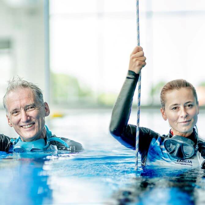 W ciągu dwóch dni, pod okiem doświadczonego instruktora, udoskonalisz technikę oddechu, poprawisz kontrolę ciała i osiągniesz głębokość do 20 metrów — a po ukończeniu kursu otrzymasz międzynarodowy certyfikat Freediver.